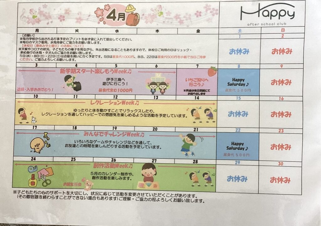 2023年3月28日 / 最終更新日時 : 2023年3月28日 famhappy happy-ブログ Happy4月の活動予定🌸 こんにちは! 放課後等デイサービスHappy(ハッピー)です🌟 4月の活動予定をお知らせします🌸 4月はいちご狩りや楽しいおでかけを予定しています🍓 新年度の始まりの月🌸子どもたちの様子を見ながら活動していきます☺️ \ 最新情報をチェック / FacebookXBlueskyHatenaCopy コメントを残す コメントをキャンセルメールアドレスが公開されることはありません。 ※ が付いている欄は必須項目ですコメント ※ 名前 ※ メール ※ サイト 次回のコメントで使用するためブラウザーに自分の名前、メールアドレス、サイトを保存する。 上に表示された文字を入力してください。 Δ