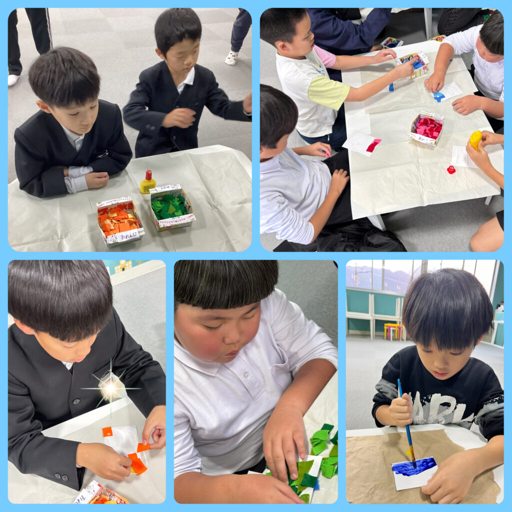 色をよく見て、色紙やフェルトを貼っていくよ💚